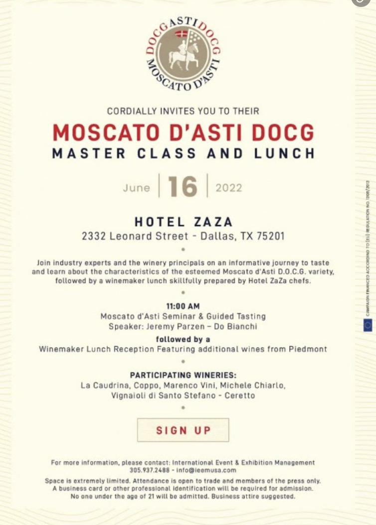 Moscato d'Asti DOCG Master Class a pranzo, 16 giugno a Dallas.